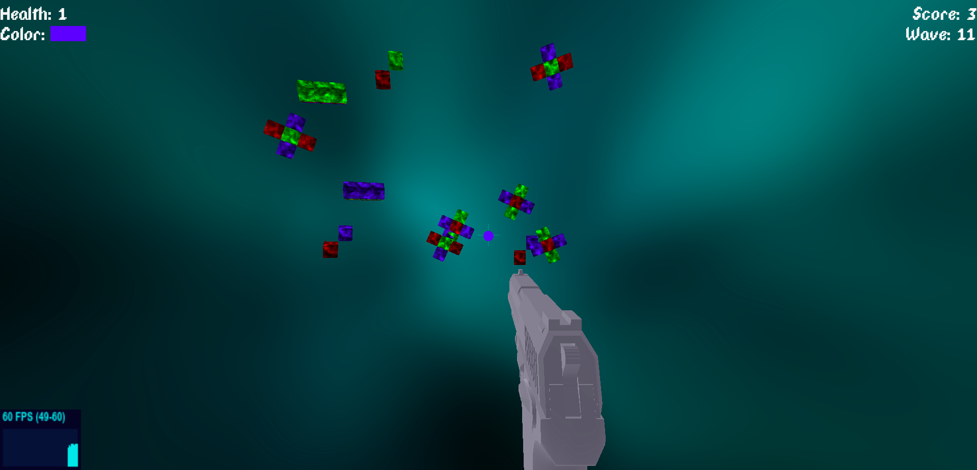 Each cube has a different color - Red Green or Blue and you need to shoot the right color at each cube.